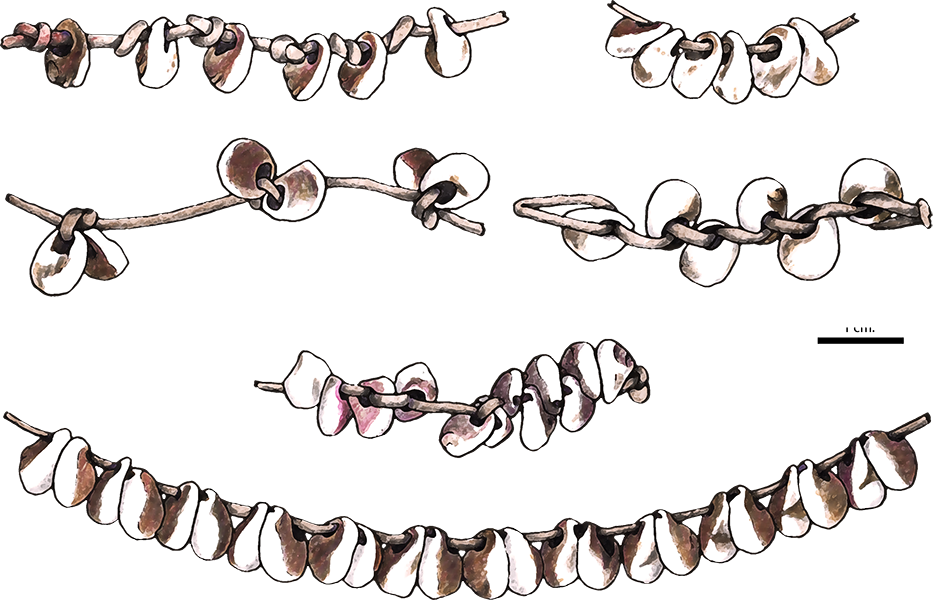 Nassarius Kraussianus Perlen aus der Mittelsteinzeit von Blombos Höhle, Südafrika. Ich zeichnete sie für mein Buch nach dem Artikel ”Thinking strings: Additional evidence for personal ornament use in the Middle Stone Age at Blombos Cave, South Africa”, Journal of Human Evolution 64 (2013) 500–517